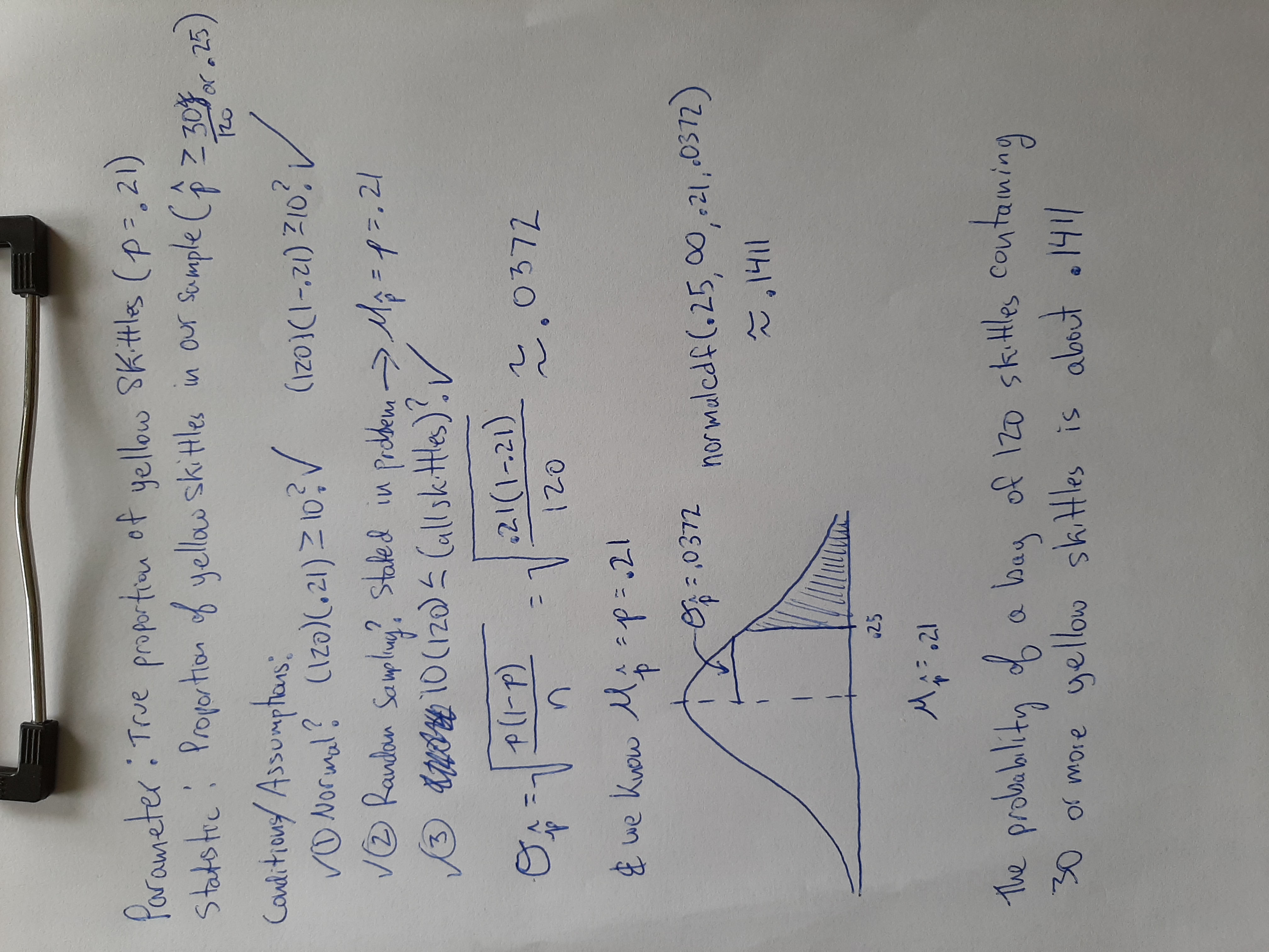 Below are a few additional questions related to sampling distributions for proportions. These are the sorts of questions that you'll be expected to answer on an AP test. Be sure to check all necessary conditions and show all work. Do your work on paper and upload a scanned image for the questions below. See the example below for what an exemplary response looks like for these types of problems.